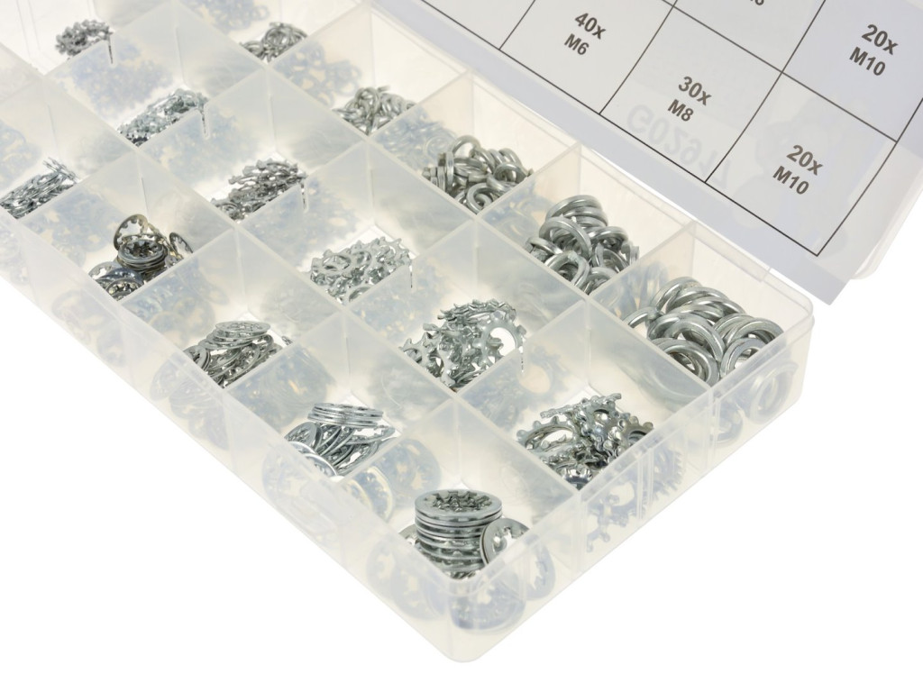 A készlet három különböző típusú rugós alátétet tartalmaz, kényelmes, átlátszó rendeződobozban.
